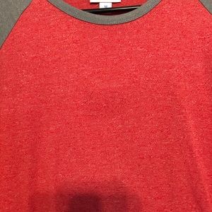 Heathered red with grey sleeves. Has a small spot on the chest that can be removed with oxy clean