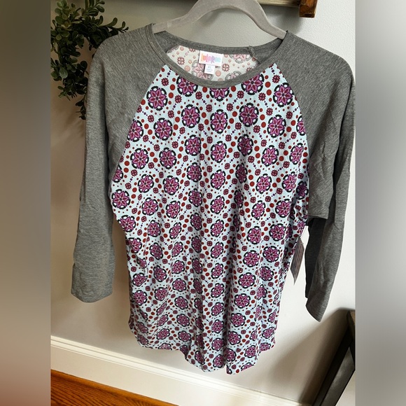 Gray sleeves, light blue/red/purple medallion middle pattern.
