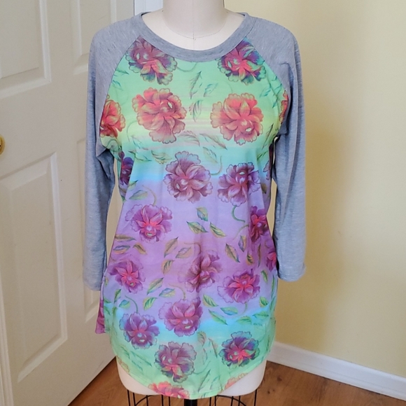 Bright green, purple, and blue print with flowers and heather gray sleeves