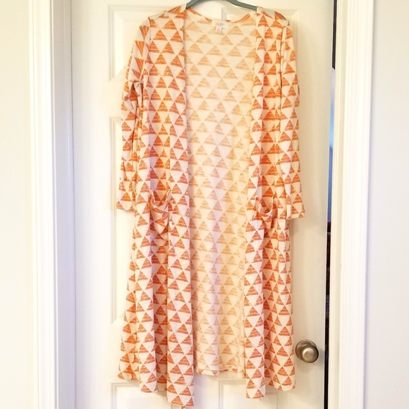 Beautiful burnt orange triangle pattern over a cream base. Great condition!! Long cardigan, approximately knee length.