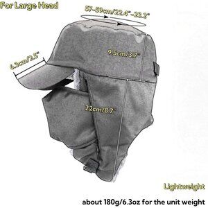 Large and lightweight winter hat with brim: 57-59cm/22.4”-23.2” for the hat circumference; 6.3cm/2.5” for the brim; 9.5cm/3.7” for the hat depth; 22cm/8.7” for the earflap length; about 180g/6.3oz for the unit weight