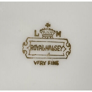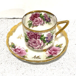 Vintage LM Royal Halsey Very Fine porcelain tri-footed tea cup & saucer set. This example is a lovely iridescent finish porcelain with pink roses and greenery motif and gold trim. Rose motif continues inside the cup. Clearly hallmarked on the base - Royal Halsey is made in Japan - this set is circa 1950's and very pretty with no damage or flaws. Perfect to add to a collection or give as a gift!