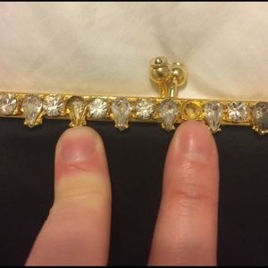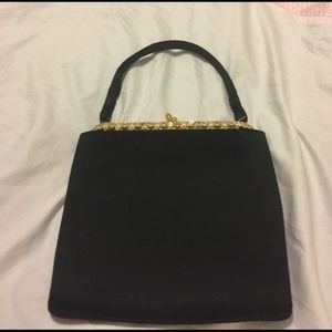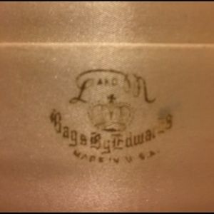 L&M (Lowy & Mund,) Bags by Edwards. Lowy & Mund produced purses in the 50s and 60s. Satin inside and out. Out is in great condition. Inside has a few spots from use, but in good shape for its age. The bag is missing two stones, as pointed out in one of the pics, but they're hard to see unless you're really looking. Bag drop 5 inches, width 7 1/2, length 7.