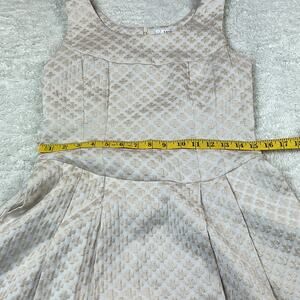 Cream fit and flare dress with embroidered floral polka dot pattern. Crew neck with hidden back zip closure and slip liner. No stretch, and no pockets.