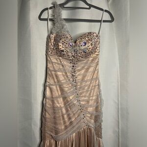 L’Mode Bridal Champagne Sparkly Rhinestone Prom Dress. Stunning sparkly dress fit for prom or homecoming. Champagne/nude color underneath with a silver sparkly mesh overlay. One shoulder with the same silver glitter mesh strap. Sweetheart neckline, ruched bodice, high slit on left leg. Super sparkly, high quality crystal rhinestones along the chest and back of the dress. Removable cups. Does not have a size listed, please refer to measurements: