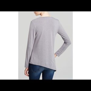 Crewneck, long sleeves, asymmetrical hem. Polyester/rayon/spandex. Dry clean. Made in USA. Color: green
