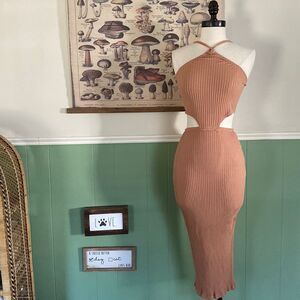 LNA Emmy Tan Camel Ribbed Cut Out Midi Dress