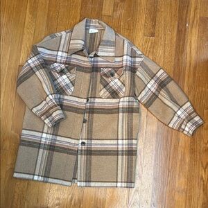 Stylish plaid button-up jacket in brown and tan with purple and turquoise details. Oversized button-down shacket with two front pockets and two side slit pockets. LNA.