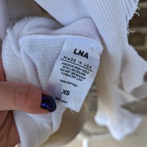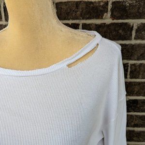 White, 100% cotton, long sleeve tshirt with slashed sleeves. Shirt has a wide neck with a small slash. Double layered hem around the bottom. Fabric is semi sheer and shows minor wash wear. Overall in good condition. Size XS, but it definitely fits oversized. Can provide additional information if needed.