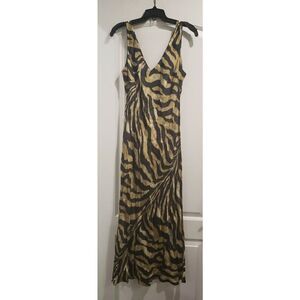 Introducing the stunning LNA V Slip Silky Dress Odyssey, perfect for any occasion. This beautiful dress features an eye-catching animal print pattern on a multicolor rayon and viscose material with a sexy v-neckline and sleeveless design. The pullover closure and midi dress length make it easy to wear and suitable for weddings, parties, cocktail events, and workwear.