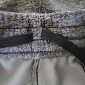 Elastic waist, but they are adjustable on the inside. Pockets. Straight legs. 100% Polyester.