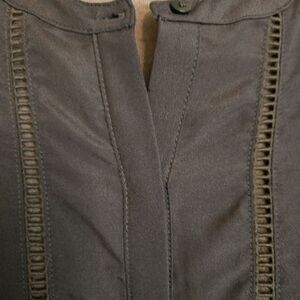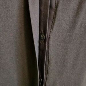 Like new! Charcoal color. Buttons down the front. Material on the front of the chest has a more silky feel. Body:95% Rayon, 5% Spandex. Woven trim: 100% Polyester. The top does stretch a bit if you need it to. Chest:18" from armpit to armpit. Waist:18" from side to side. Hips:19" from side to side. Length:17" from the armpit down. Smoke-free, pet-free home!