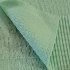 Light green, not quite as "minty" as mint. Longer in the back. 52% Acrylic, 27% Nylon, 20% Polyester. Chest-22.5" from armpit to armpit. Waist-21" from side to side. Length-17" from the armpit down in the front, 20" in the back. Small slit on the bottom of both sides. Nice and soft!