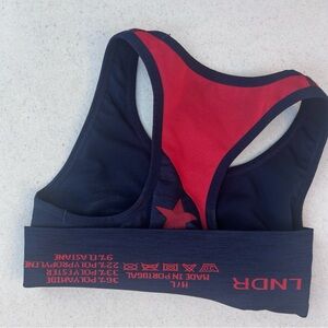 LNDR racerback sports bra featuring a red star and geometric patterns in red, fuchsia, and navy. Pullover style. No padding. Medium-high support.