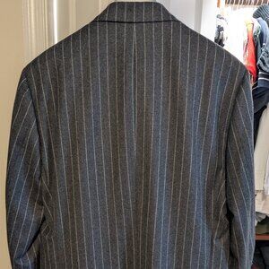A beautiful and current single-breasted charcoal chalkstripe suit by Isaia Napoli. Suit jacket features dual rear vents, two-button front, full canvassing, notch lapels, and working cuffs. Tons of handwork, including phenomenally done working cuffs and front buttonholes. Trousers feature a flat front, no cuffs, and belt loops. Never wore it but had it dry cleaned, so ready to wear. Tagged size is EU54R, but based on the measurements, I'd say it's closer to a standard US40R or a slim US42R. Approximate measurements (taken laying flat):