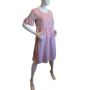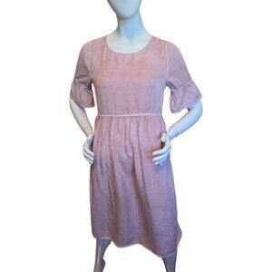 This soft pink dress by Tea & Rose is 100% Tencel, a type of rayon made from wood pulp from sustainably harvested eucalyptus trees. This dress has a washed appearance and features elbow length ruffled cuffs, gathered waistline, loose falling skirt that hits right at knee line and a classic rounded crew neck. SHE HAS POCKETS!!!!! Excellent like new condition. No rips, holes or stains.