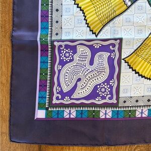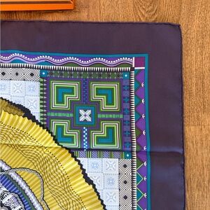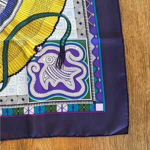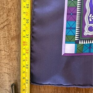 Purple, yellow, blue, green. 100% silk. 90 Hermes scarf, 34.8” x 34.8”.
