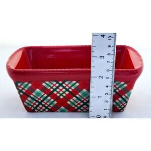 Small ceramic loaf dish by Temp-tations. This is a red color solid interior. The outside is a plaid in red & green. It is a small, gift size, ceramic loaf dish. It measures 6" long / 3.75" wide / 2.5" tall. The bottom says it is a 12 oz dish. Great holiday or otherwise gift.