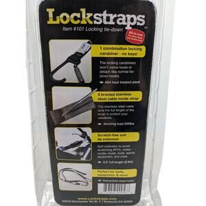 New-in-Package LOCKSTRAPS locking tie-down strap with 2 locking carabiners. The 1.5" wide black strap is rated for a working load of 500 pounds & is 8.5 feet long . Useful for locking down ATV's, motorcycles, boats, tools, sports equipment, RV accessories etc.