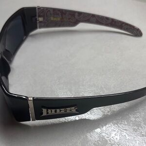 Chic black sunglasses with stylish paisley design on the arms. Ideal for any sunny day outing.
