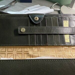 BRAND NEW. The Traveller Wallet features a criss-cross woven pattern and a sleek design, allowing it to be carried as a crossbody or a small handbag. It opens with a simple button unfastening, revealing a built-in accordion design that expands. The top face includes 8 card sleeves, securely held by a long strap. The interior is divided into three sections for cash or slim documents. The innermost section includes a long zipper pocket, and the middle section features an ID card slot. Leather: Drum Dyed Pebbled Leather (100% Genuine) Color: Dark olive green. almost looks gray/black Dimensions (in Inches): L: 8.38"W x 4.50"H x 1.00"D