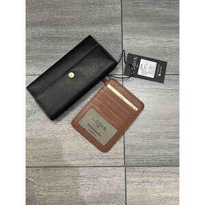 LODIS Texas Leather 2-Piece Wallet Set Black/Chestnut From LODIS. Includes large wallet and small wallet Large wallet: main compartment with flap button snap, one exterior zipper pocket, three interior slip pockets, 12 credit card slots, ID window Small wallet: one exterior zipper pocket, five credit card slots, one ID window Measurements: Large wallet 7.375" x 4" x 0.75"; Small wallet 4.125" x 5.5: Body 100% leather; lining 100% polyester Imported