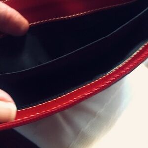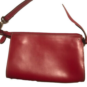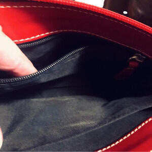 Bright red leather, zippered top, two compartments one with zippered inside pocket. So versatile can be carried by top handle or handle can be attached to another bag. Barely used has years of use left!