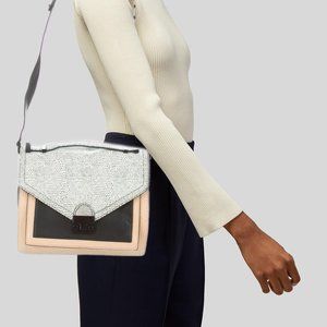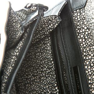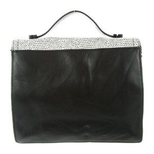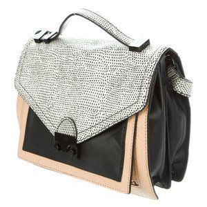 Black, ivory and camel printed leather Mini Rider satchel with coated black hardware, single flat top handle, single flat shoulder strap with peg-in-hole adjustment, dual slip pockets at front exterior, dual interior compartments, black and creme printed woven lining, three pockets at interior walls; one with zip closure and one with snap closure and push-lock closure at front flap. Includes dust bag. In great condition.