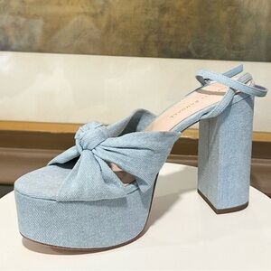 The Roz sandals from Loeffler Randall are crafted of denim with a knotted strap and a platform sole.