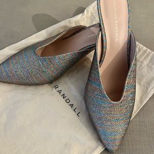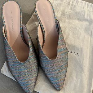 Juno Glitter Striped Mules in 9.5. Fits true to size. Very comfortable and I got so many compliments on them. They will elevate any outfit but in a subtle way. The rainbow/sparkle fabric is unique and interesting without being too much or tricky to wear. They are in near new condition except for the bottom. Pointed toe; kitten heel; slip on; pump mule style; leather lining + sole