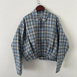 This Loewe jacket is crafted from a blend of polyester and wool. The jacket features a classic pointed collar, long sleeves, and a zip-up front. It also has two slip pockets, draped detailing, and an embossed leather logo patch at the back. It is fully lined and made in Italy. The fabric is lightweight with a slight stretch. The jacket has a checked pattern.