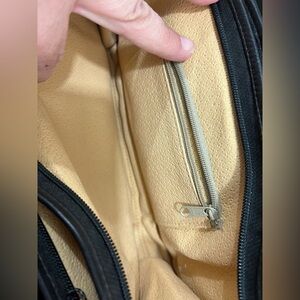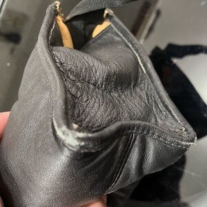 Sleek and stylish black leather Logo Cosmetic Bag, perfect for everyday use. Durable and versatile, this bag complements any outfit. Preowned with normal usage on. Bottom corners and light marking on front.
