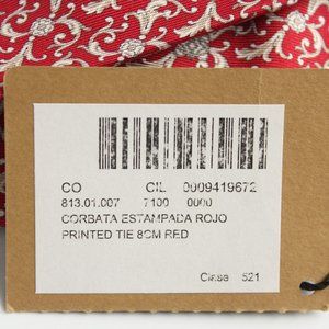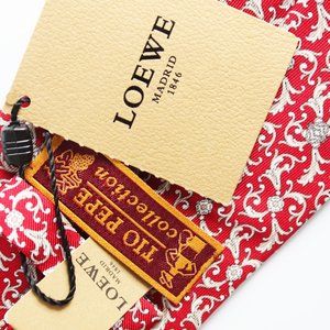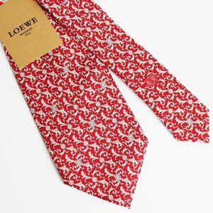 New with tags, new old stock mens necktie by LOEWE Madrid, likely made after 2000. Made from silk, it features a rich baroque motif against a red background.
