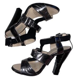 -details: leather open toe t-strap slingback heels in black and silver colorblock and sculptural heel, comes with box.