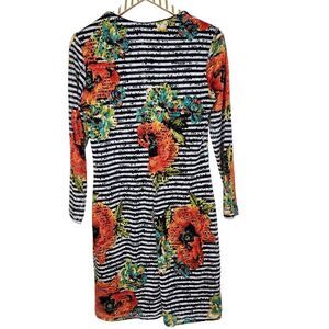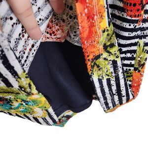 Beautiful v neck dress with blue and white stripes. The top layer has eyelet cutout details. Vibrant blue and orange florals throughout. Lined.