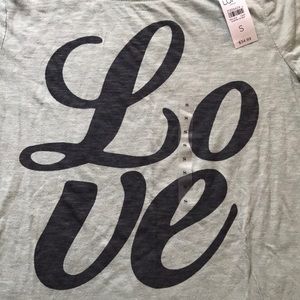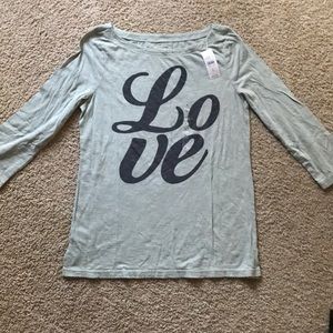 Graphic tee features a boatneck and sleeves that hit below the elbow.