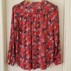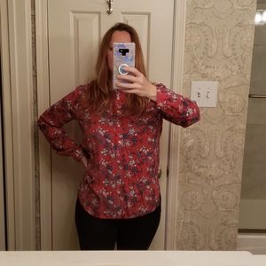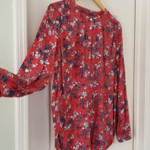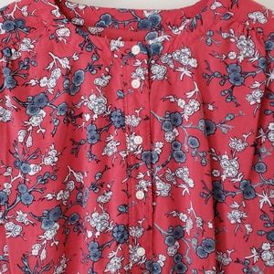 Beautiful pinkish red blouse with blue and white flowers! This top is really lovely! EUC Pit to pit 22" Top to bottom 24"