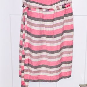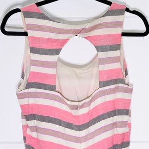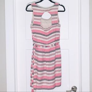 Amazing Ann Taylor LOFT dress. Multi colored, grey, pink, cream, striped Linen material dress with back cutout. Side zip with waist tie.