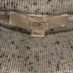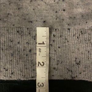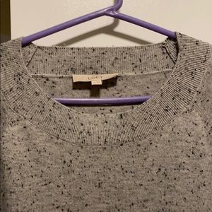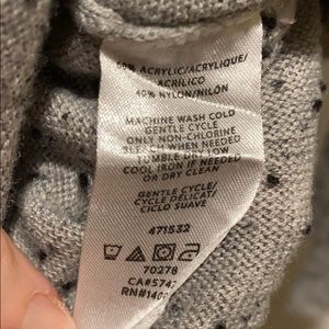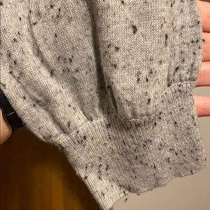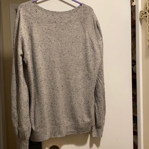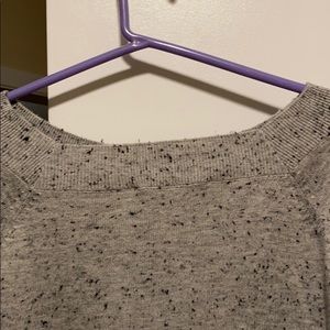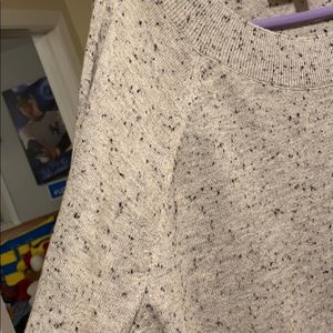 Relaxed fit sweater. Has a ribbed hemline and cuff, the cuff has gathers for a nice effect. Super soft. There is a black “speckled” type design. Really nice with leggings and boots or jeans with a nice scarf.