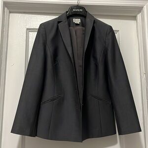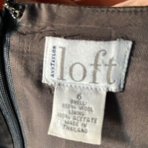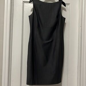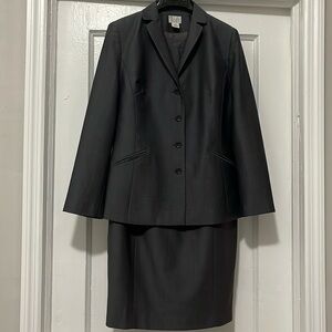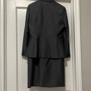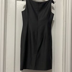 Grey two piece suit, sleeveless shift dress, boat neck, fully lined; 4 button jacket w/pockets, slim collar & lapel, fully lined, 100% Wool, 6.