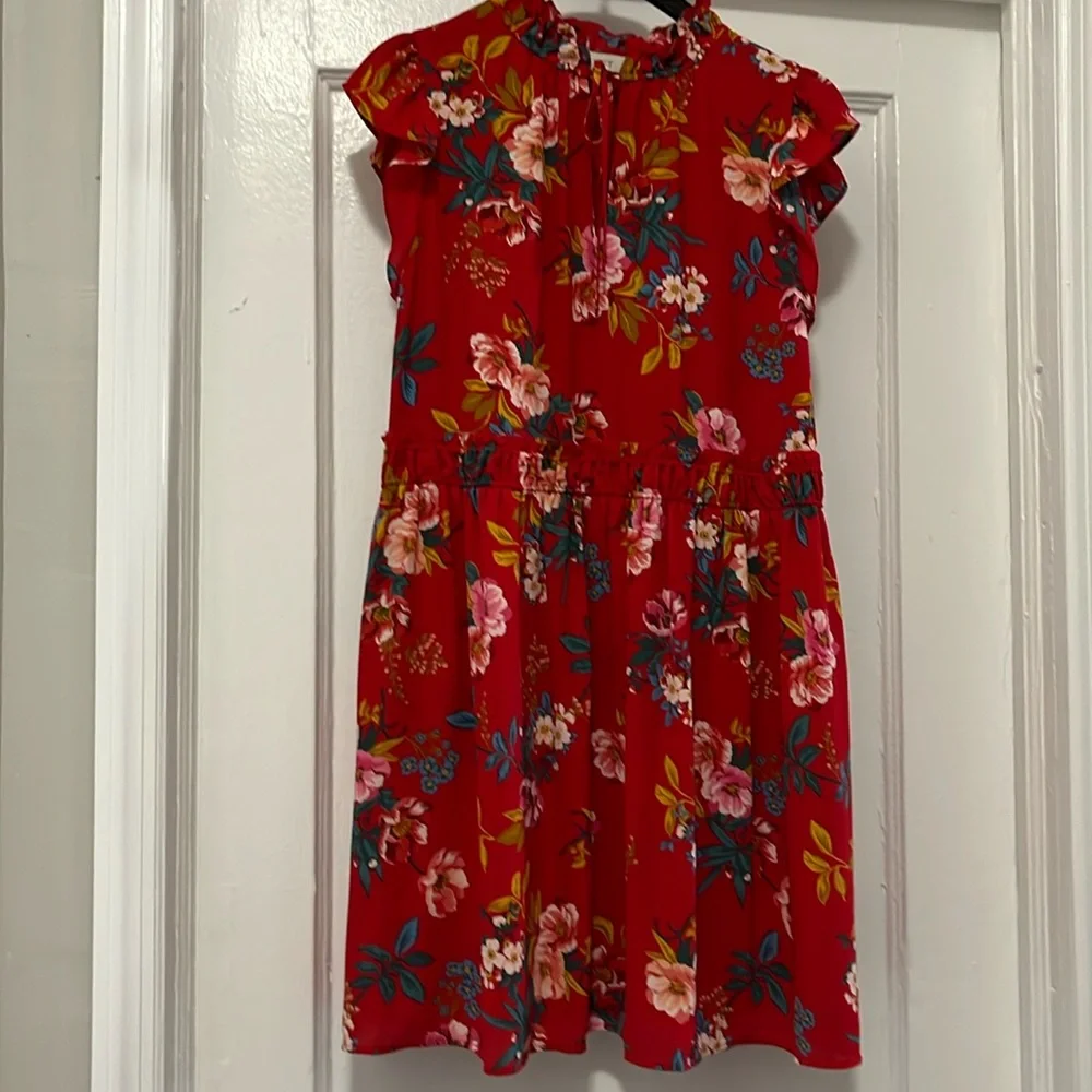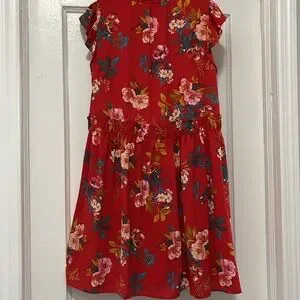 Red floral print, butterfly collar & sleeves, gathered waist, fully lined, 100% Polyester