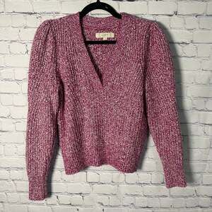 LOFT women's V-neck sweater in a vibrant magenta marled knit, featuring stylish puffed sleeves. This cozy and chic sweater is perfect for adding a pop of color to any casual or semi-dressy outfit. Made from a blend of 52% cotton, 47% polyester, and 1% spandex for a comfortable fit. Excellent pre-owned condition with no visible flaws, stains, or holes. Retails for a higher price, offering great value for this stylish piece.