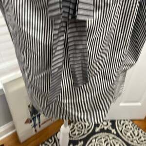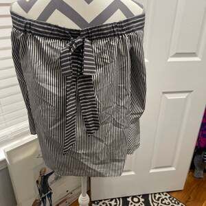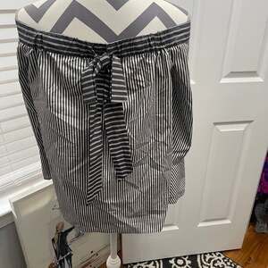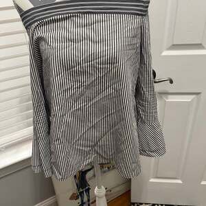 Stylish LOFT off-the-shoulder blouse in a classic black and white stripe pattern. This top features long sleeves with smocked accents and flared cuffs, adding a touch of elegance. A tie-back detail enhances the silhouette. Perfect for a chic casual look or dressed up for an evening out. Excellent pre-owned condition, no visible flaws.