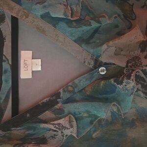LOFT teal and gray floral dress. Button down and ruffled bodice. Elastic waist with drawstring to make it more fitted. Fully lined. Outer layer is chiffon and lining is polyester. The material does have some stretch. Perfect for casual wear or the office. Easy to dress up or down.