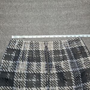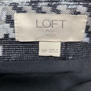 Plaid LOFT 10P skirt features metallic woven details, black/gray plaid pattern, and full lining with rear zip closure (approx. 18" length, 16.25" waist flat)
