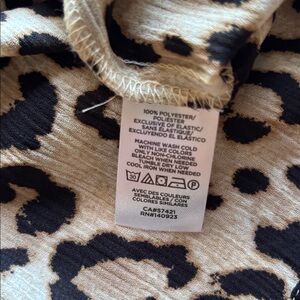 Elegant blouse with bold animal print. Features ruffled neckline and soft fabric.