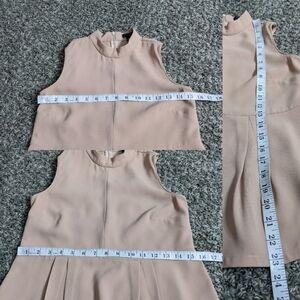 Neutral peplum top has a small stain on the front and the outer stitching in the back is undone in one spot (see photos)