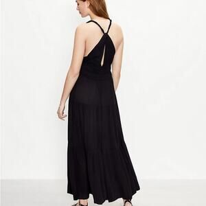 Keywords: LOFT, black maxi dress, sleeveless dress, V neck dress, smocked waist, tiered dress, casual dress, party dress, summer dress, vacation dress, women's dress, open back dress, criss cross strap, long dress
