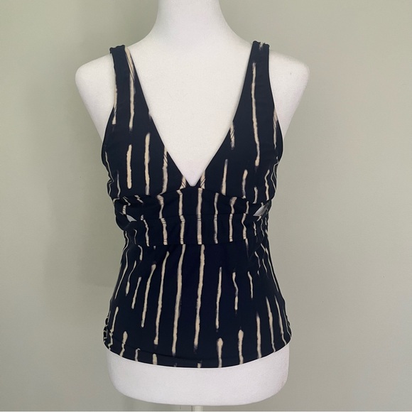 Chic tankini with a striking tie dye lined pattern. Ideal for beach days. Navy and white, full coverage bottom, side cutouts, and gold back clasp.