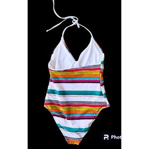 LOFT Beach Swimsuit Size 4 Striped One Piece Halter Shelf Bra V Neck New…